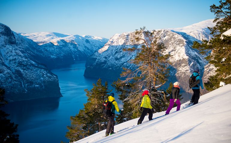 Today you will enjoy a guided hike into the local mountains, for an exceptional view of the fjord at Stegastein viewpoint in Aurland. Experience how it is to hike on traditional snowshoes. The spectacular landscape has shaped the way of life here for generations and you will stop several times during the tour to share the guides’ passion and knowledge about the area. As on traditional Norwegian snowshoe hikes, there will be served hot beverages to warm you up. The trip is suitable for beginners and is a fun way to access nature during the winter season. General fitness is required, but no experience is needed. Ths trip is available from January to March.